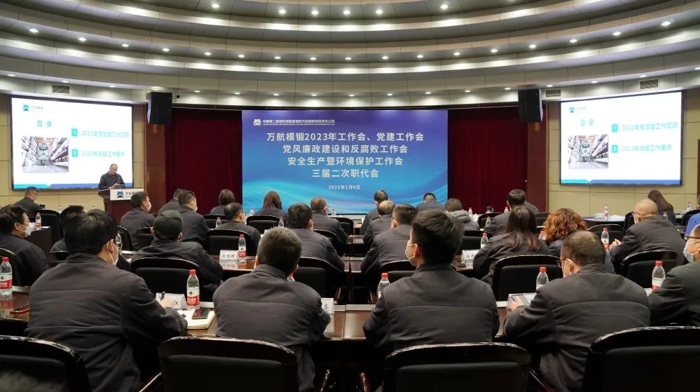 1月6日,万航模锻召开2023年工作会、党建工作会、党风廉政建设和反腐败工作会、安全生产暨环境保护工作会、三届二次职代会。公司领导班子成员参加会议,国机重装外派董事、监事,航空工业驻二重代表室负责同志应邀出席会议?;嵋橛晒镜澄?、副总经理康峰主持。