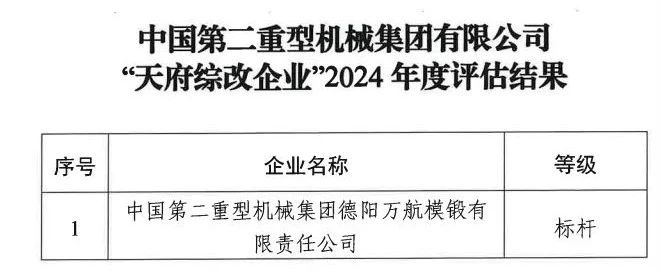 近日,四川省政府国有资产监督管理委员会公布了“天府综改企业”2024年度评估结果,万航模锻在全省100户“天府综改企业”中脱颖而出,再次获评“标杆”企业。